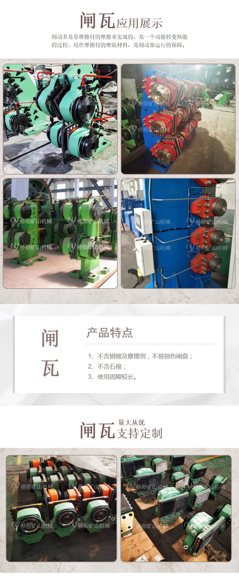 提升系统是矿井生产的咽喉,制动装置作为提升机一道也是关键的保障系统,其主要实现形式为盘形制动器。制动多是靠摩擦付的摩擦来实现的,是一个动能转变热能的过程,用作摩擦付的摩阻材料,是制动器运行的保障。