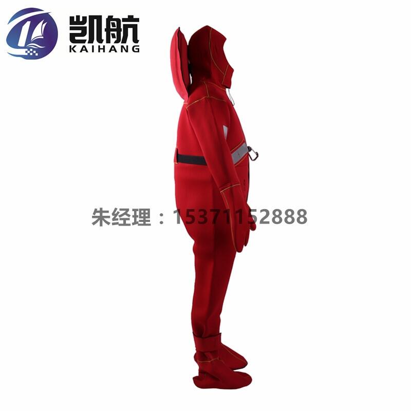 帽(可带有面罩)、衣、裤、靴、手套等水密连为一体(手套亦可不连接)的具有规定保温性能及浮力性能的救生服装。