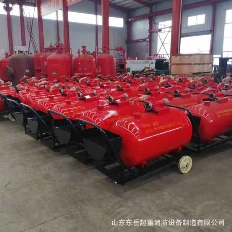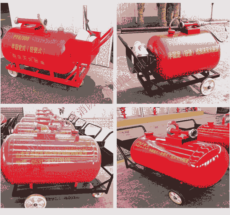 移动式泡沫车、PY移动(车)式泡沫灭火装置是一种轻便移动灵活的推车式灭火设备。它采用PHF型管线(负压)式比例混合器,可与泡沫产生器组成低、中、高倍数泡沫灭火系统。当压力水经过混合器时,水跟泡沫液按一定比例混合,经泡沫产生器喷射泡沫扑灭火灾。由推车、常压泡沫罐、负压比例混合器、喷射设备、水龙带、安全阀、控制阀门及一些辅助零部件等组成。