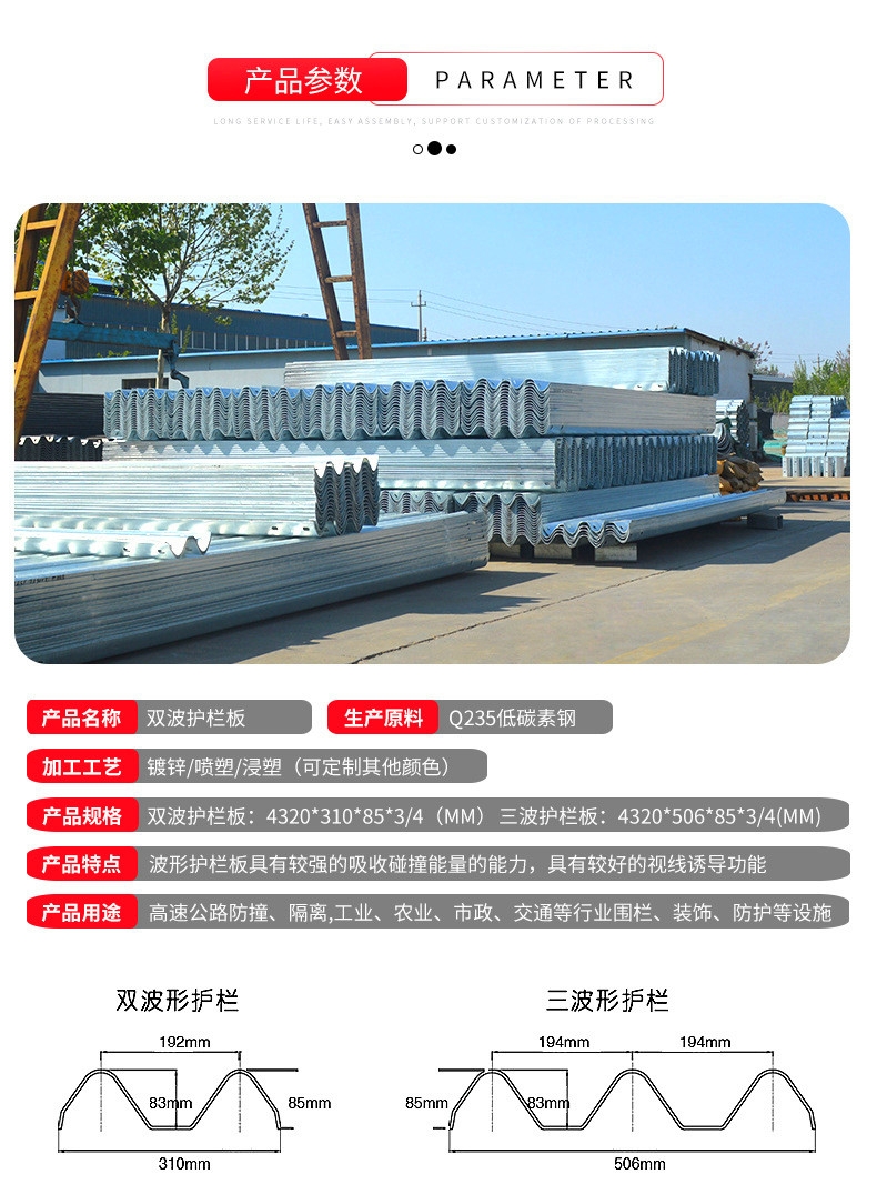 我们的主要业务包括:高速公路护栏板、波形护栏、桥梁护栏的生产、销售与安装。我公司引进先进的冲压、切割、磷化、冷镀锌、热镀锌、大型静电喷塑等全套生产设备。产品通过了工程监理检测中心(国家交通安全设施质量检测中心)的验收,全部符合:交通行业标准JT/T281—2007《高速公路波形梁钢护栏》、国家标准GB/T18226-2000《高速公路交通工程钢构件防腐技术条件》。年生产能力为15万吨。配备实验室,设立全套的产品检验深州市政通交通设施有限公司是一家专注于交通设施防护产品领域,拥有较强的生产、销售、安装的综合业务能力的公司,我们下设生产部、销售部、财务部、供应部、技术质检部、业务部、办公室七个部室;冲压、制管、成型、喷塑、镀锌等五个生产车间;二个波形护栏板施工安装工程队。通过整合团队专业的市场营销理念与产品技术为您提供优质的服务。