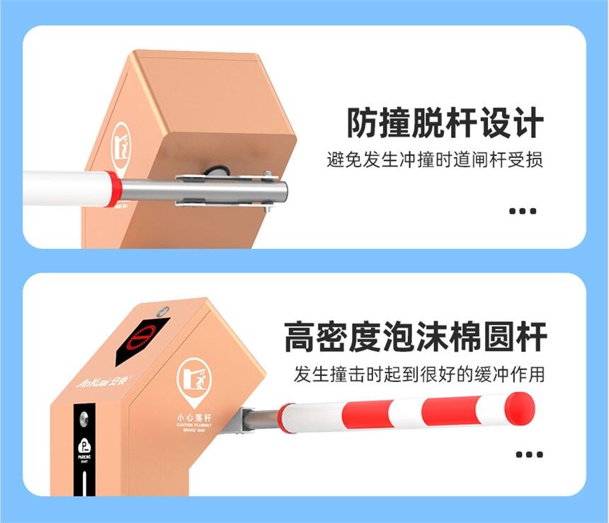 3.精巧结构、防撞设计:高密度泡沫棉闸杆,有效降低意外砸伤风险;防撞脱杆设计,闸杆被撞不易损坏手动复位。
