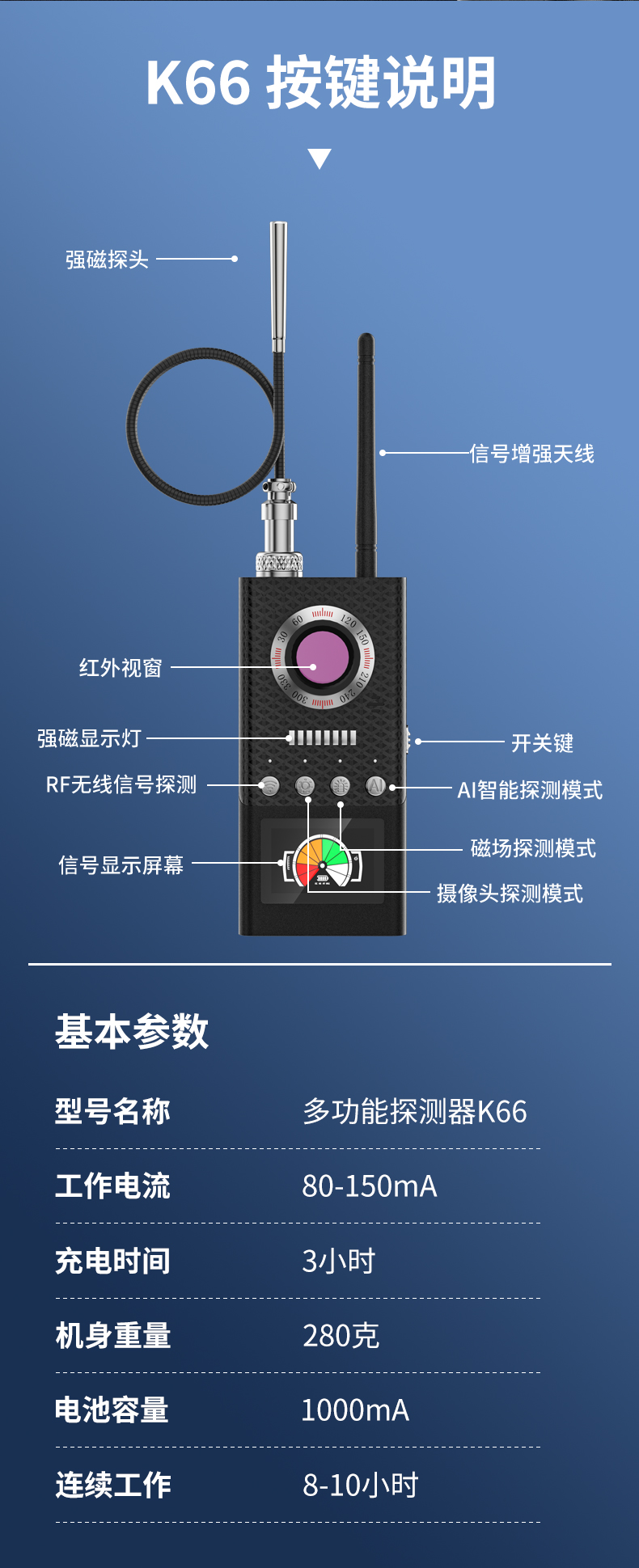酒店摄像头防偷拍K66信号探测器检测汽车反定位监控GPS防偷听K66
