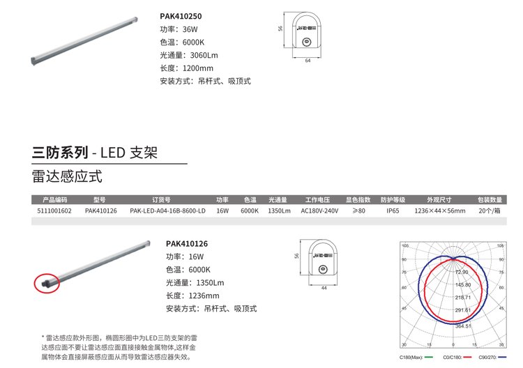 PAK三雄极光LED三防支架灯8W/16W/18W/30W/36W防水IP65一体化支架 品牌 | 三雄极光 | ||