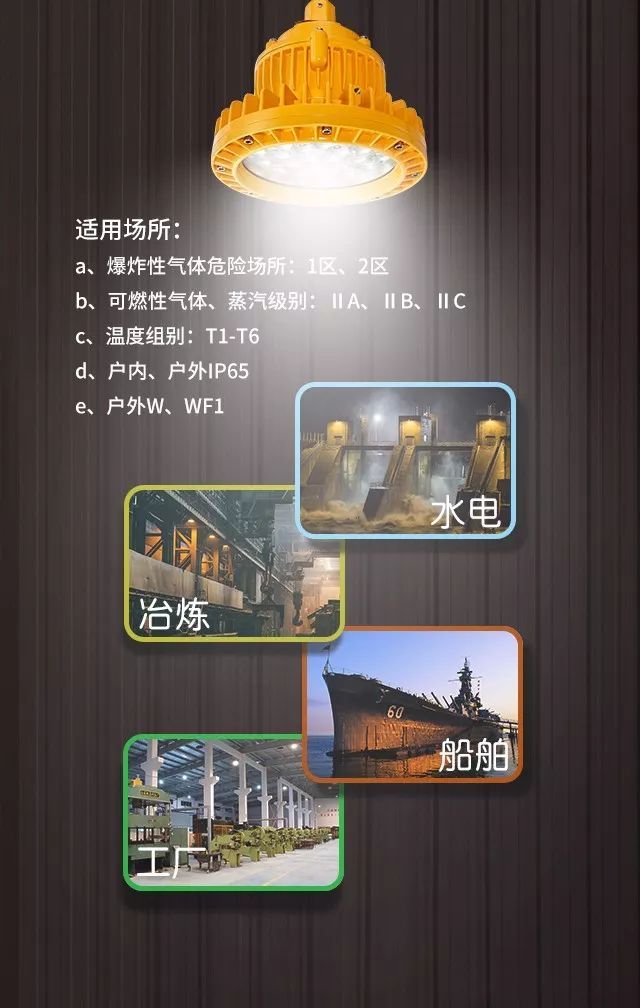 LED 吊式防爆灯采用防水尘式的密封设计,IP 等级达到 65;