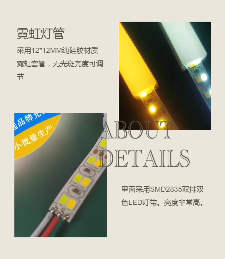 LED柔性霓虹灯条采用SMD2835双色温灯条,纯硅胶材质霓虹管,可以任意弯曲,直行发光,侧面弯曲,双色温顾名思义就是一种灯可以调光调色3种颜色,广泛应用于墙面装饰,智能展厅。