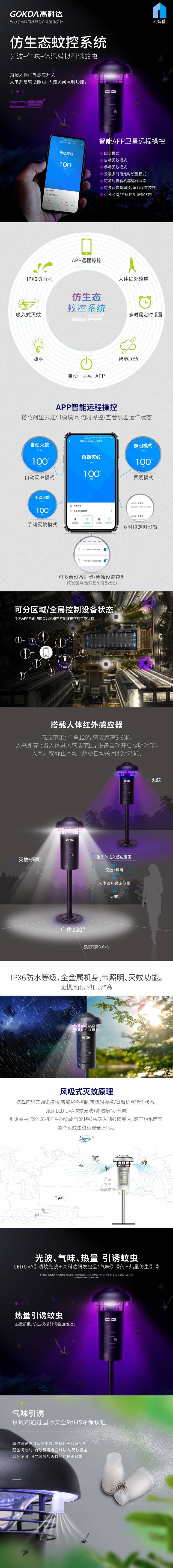 GOKDA高科达蚊控系统运用生物诱蚊技术和物理灭蚊设备,采用LED UVA光波引诱 气味引诱 人体热感引诱蚊虫靠近,高速旋转的涡流风机将蚊虫吸入储蚊盒风干脱水而死。整个过程安全无污染,无毒副作用。从而达到绿色除虫、环保灭蚊的目的。