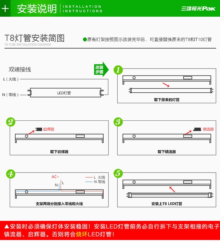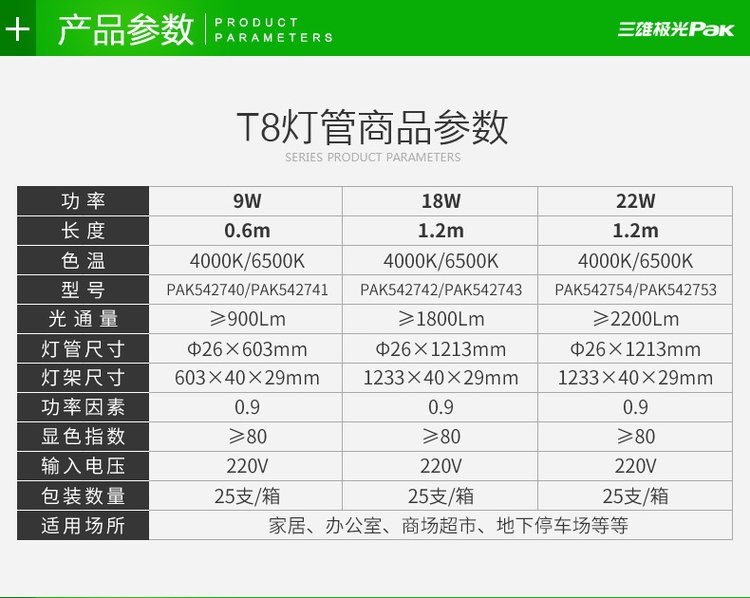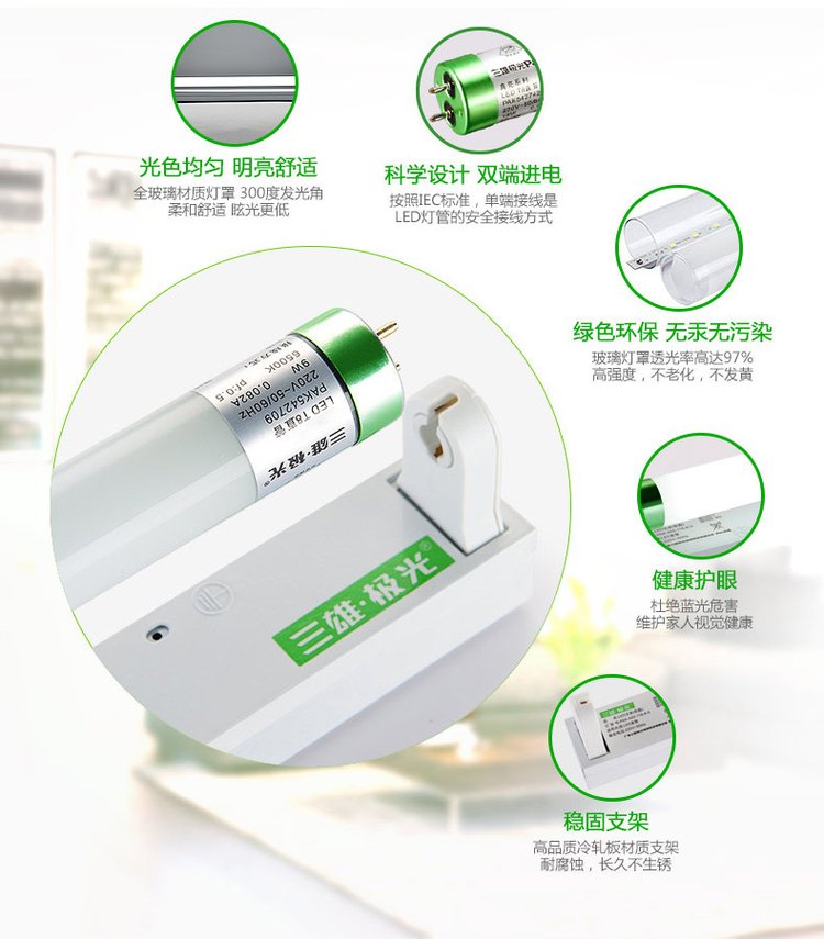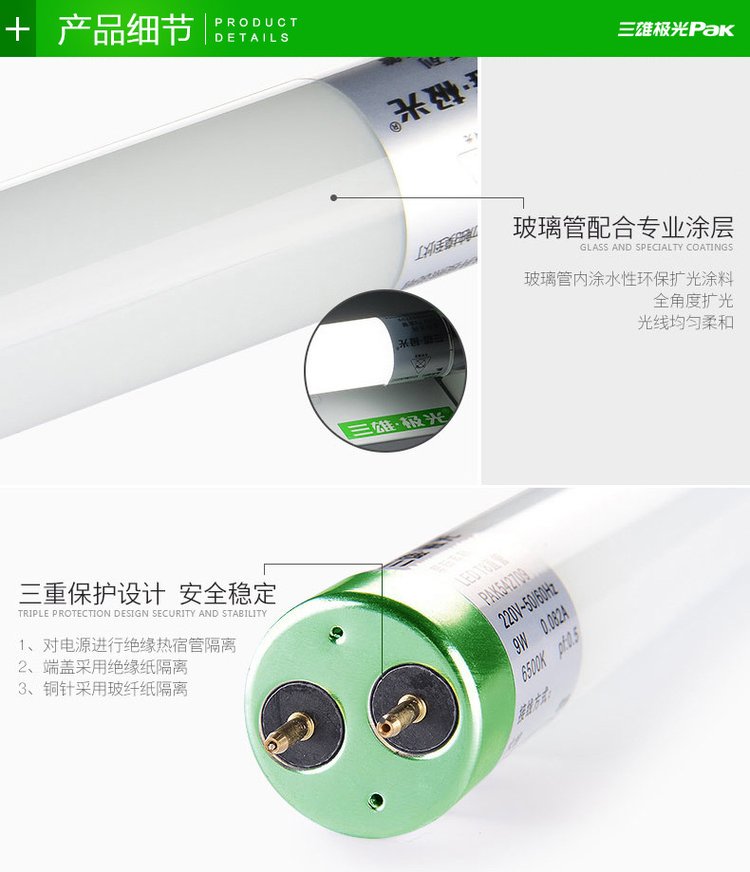 专业涂层配合玻璃管,环保耐用,300°大角度发光,光线照射范围更大,光照更加均匀。
