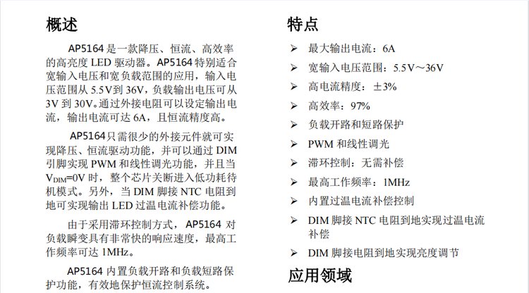 AP5164 6A大功率LED降压恒流驱动IC PWM/线性调光 汽车尾灯驱动IC 品牌 | AP/世微 | ||
