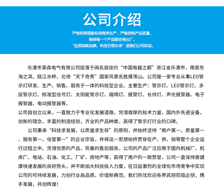 5、适于用恶劣环境下正常工作警示灯通常是用在机械设备等开发。一般情况下,用处可以提供多样的长度的产品的,有灯罩组合的构造,需要时一边方向的灯罩可以组合复合颜色。此外,还可以根据光源形式的不同,分为:1灯泡旋转灯;2LED闪光灯;3氙气灯管频闪灯,其中LED闪光形式的是灯泡旋转形式的升级版,使用寿命更长,更节能,更环保!