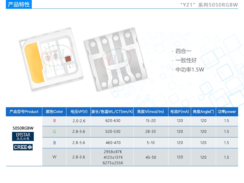 YZ1系列中功率1.5W5050RGBW LED灯珠特性及参数: