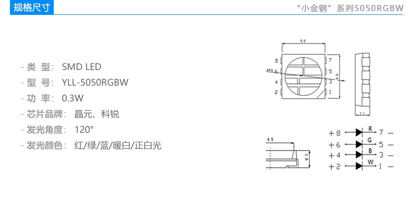 小金钢系列5050rgbw LED灯珠规格:功率0.3W