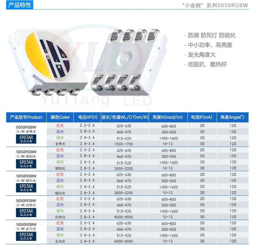 小金钢系列5050rgbw LED灯珠特性及参数:防潮、防死灯、防硫化、中小功率、高亮度、发光角度大、低阻抗、散热好