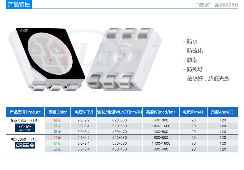 防水系列5050RGB 1.5H LED灯珠特性及参数:防水、防硫化、防潮、防死灯、散热好、超低光衰