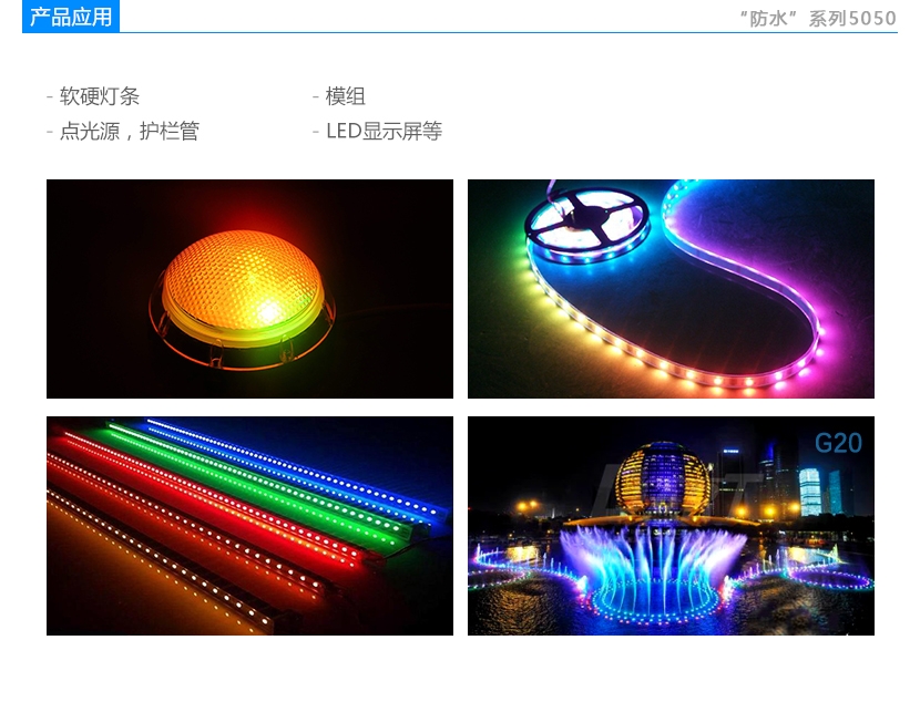 防水系列5050RGB 1.5H LED灯珠应用:软硬灯条、模组、点光源、护栏管、LED显示屏等