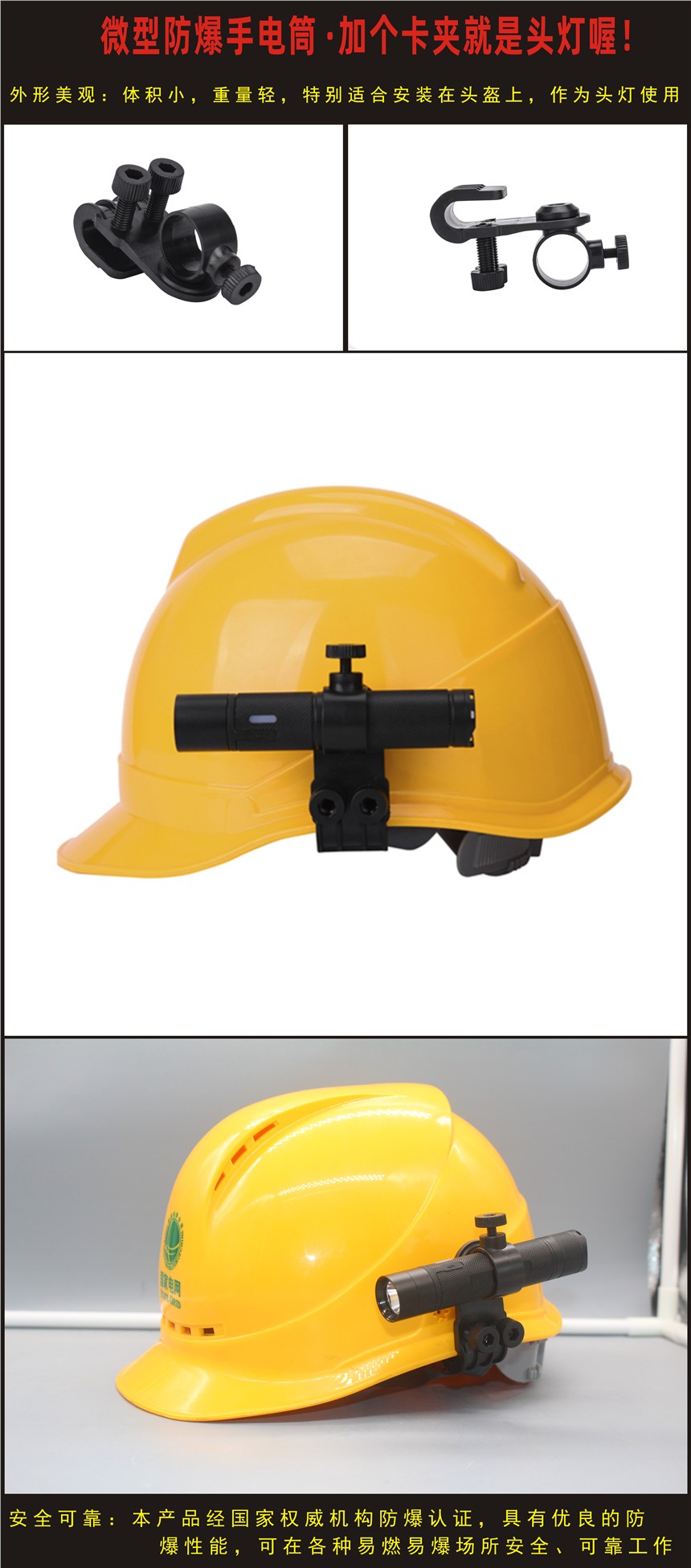 7、灯具外形精致小巧,便于携带,可手持、吊挂、腰带、袋装,配有万向安全帽专用的夹扣,可以快速的安装在上作为头灯进行佩戴式照明灯具使用,重量轻,安全牢固。