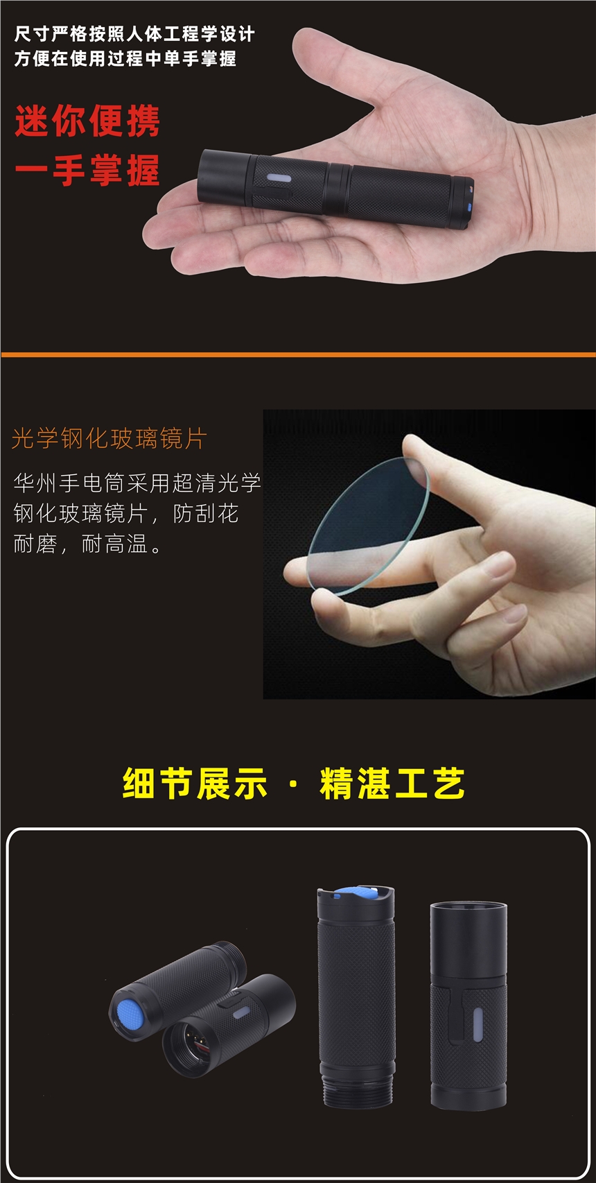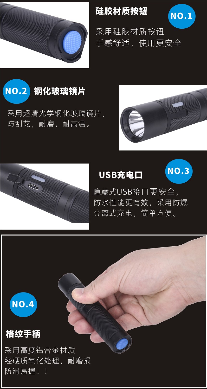6、电筒尾部开关按键处人性化的设计使用更加方便,大按钮开关键配合尾部弧度轮廓可以满足使用者在使用过程不会虚按的现象,同时也方便了戴手套操作。