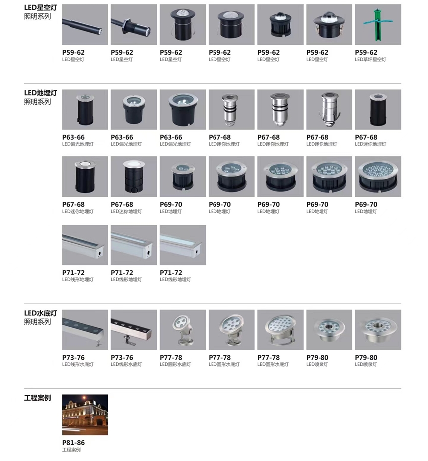 地埋灯分类:常规地埋灯(圆形,方形,长条形),匀光地埋灯,迷你地埋灯,偏光地埋灯,水下不锈钢埋灯。可选防眩装置。