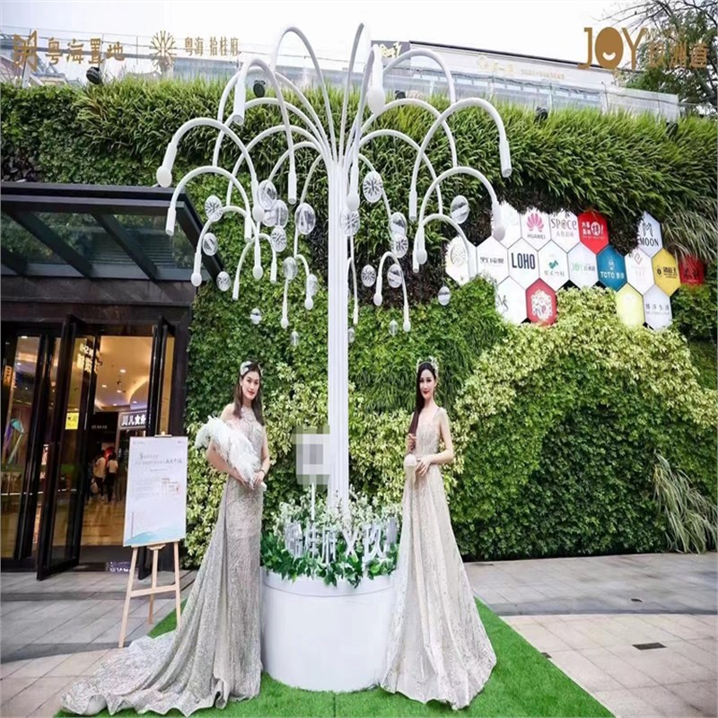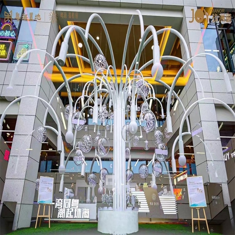 烟泡树,寓意春天的乐观主义和季节带来重生之感,由一系列白色的管道聚集而成,形成一棵树的形状。在每个“树枝”的末端,能够“长出”充满烟雾的半透明气泡,缓慢地落向地面,在与人们接触的瞬间获得美妙的回忆。具有愉悦动感的树形景观,持续不断垂落白色的泡泡,吸引人群驻足注目与体验,传播和提升目标品牌价值。