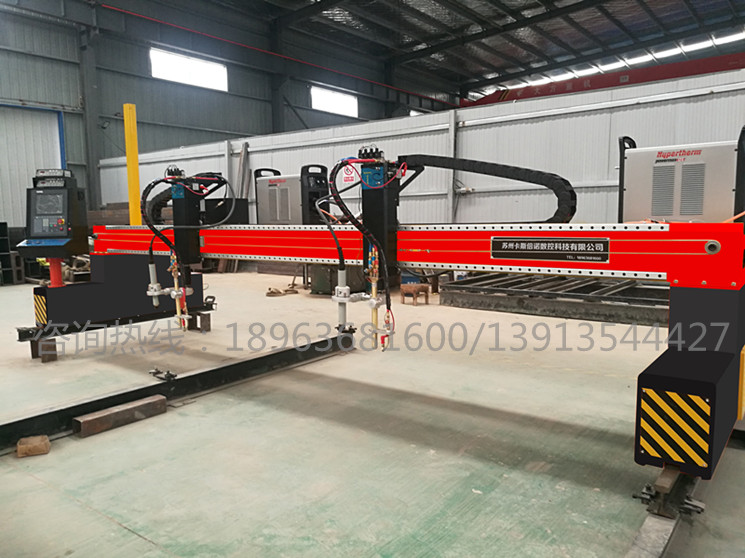 数控龙门等离子切割机的切割厚度取决于其所配置的等离子电源。等离子电源功率越大,所切割的钢板越厚。常用等离子电源主要有63A、100A、120A、200A等。