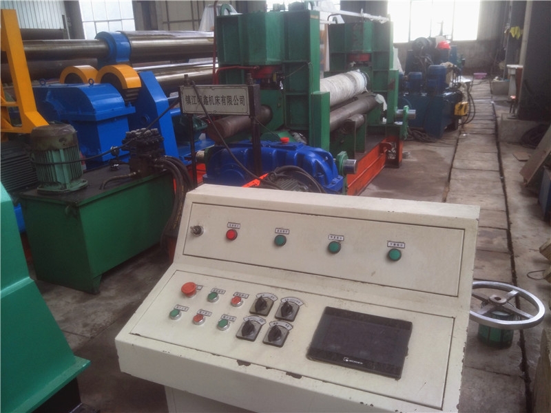 上辊可以垂直移动、水平移动。预弯通过上辊水平移动,使上辊相对于下辊呈非对称位置来实现。滚圆时通过电动机、减速机带动两下辊进行。由于下辊的标高不变,所以便于进料和操作。