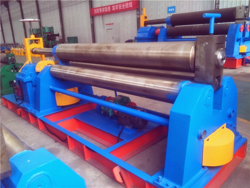 该机为对称式三辊卷板机,两下辊为主动固定辊,上辊通过升降丝杆、涡轮、蜗杆在两下辊中间对称作上下移动,两下辊的左、右旋转和上辊的升降移动均靠电机带动减速器来完成,并能借助手动离合器把上辊调节成平行或倾斜位置,以适应卷制圆形和锥形工件的需要,涡轮上下配有特种压力轴承,转动轻松、省电耐用。该机集机身、传动、电器部分为一整体,其结构紧凑、操作方便、便于搬运、安装和维护。