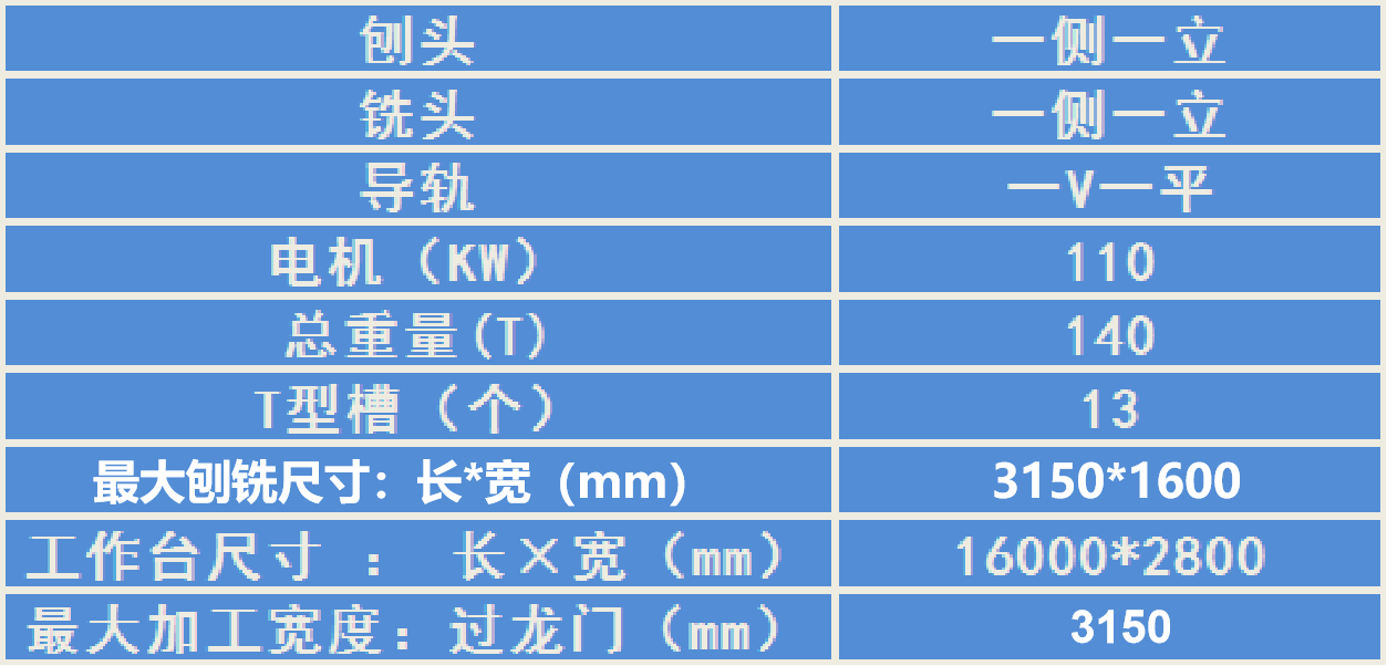 140吨的自身重量。多年的放置,床身结构经过了自然时效,残余应力松驰,尺寸精度更稳定。加宽工作台,加工宽度可达3.0米,工作台长度16米。双铣头,双刨头,配备110KW大功率电机,使运行动力更足,行进更平顺。是业内少有的重型机床!