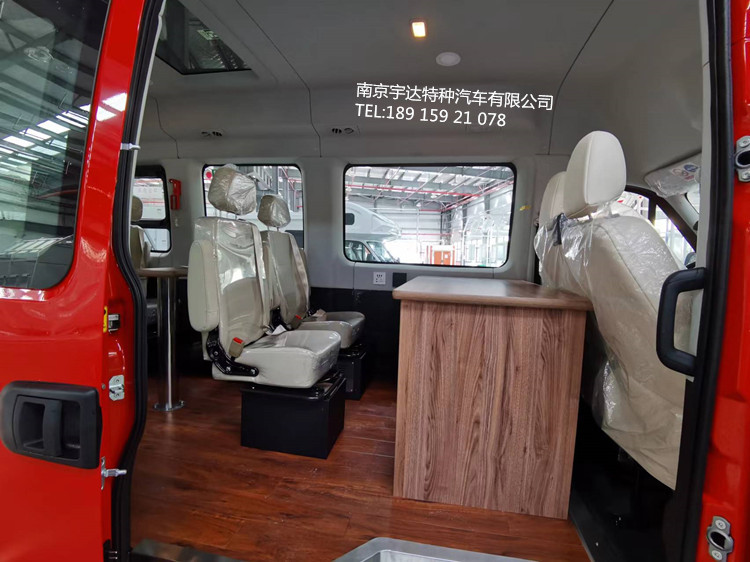 该车装备存放指挥仪器、卷线盘等设备的装备柜,主要用于指挥人员现场工作。车顶可同时或部分装备工作平台及后爬梯、换气扇、喇叭、LED显示屏、顶部空调及高杆照明灯。车身两侧可选装上掀门。原车车高为2715mm,选装复合悬架时车高为2650mm;选装工作平台、换气扇LED显示屏及喇叭时高度为2865mm;选装顶部空调及高杆照明灯时高度为3015mm。ABS系统控制器型号:BOSCH ABS9,ABS系统控制器生产企业:BOSCH公司。选装侧标志灯,侧回复反射器。发动机最大净功率,装F1AE8481D时:93KW,装F1CE8481K时:123kW。装备带卫星定位功能的行驶记录仪,选装高位制动灯,选装红色格栅、镀铬格栅,选装电动门。选装无轮罩,选装普通轮罩时整车宽度为2040mm。选装豪华轮罩,选装豪华轮罩时整车宽度为2088mm。选装铝合金车轮,选装铝合金车轮时整车宽度为2060mm,后轮距为1558mm。