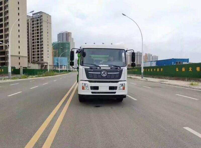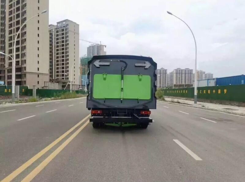 4、东风天锦12方扫路车采用吸扫结合的方式收集垃圾,湿式除尘、电液控制,液压倾翻卸料的作业方式对路面进行清扫作业。