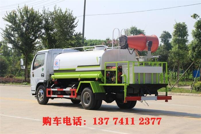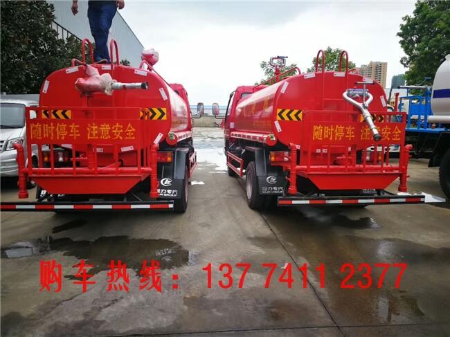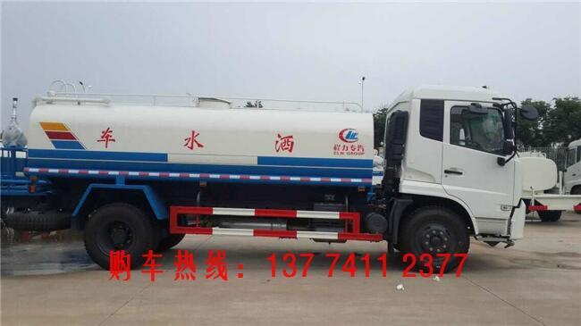 洒水车罐体材质为Q235国标碳钢,厚度为4MM,带大功率专用洒水泵,前冲、侧喷、后洒,带后工作平台和洒水高炮,高位花洒。