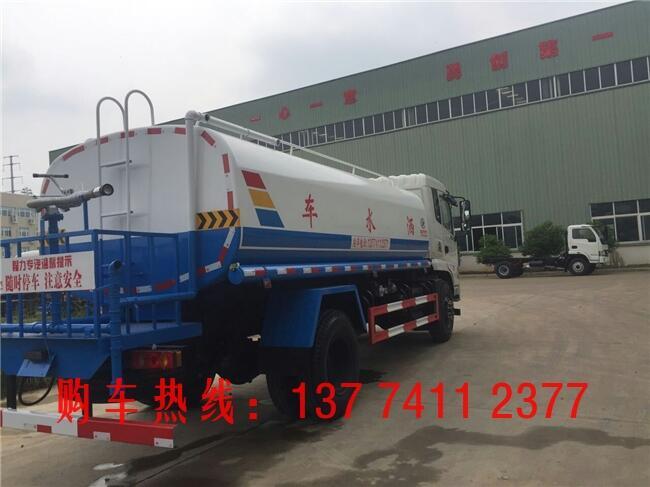 洒水车前冲(喷)后洒,带侧喷,罐体后带工作平台,平台上安装绿化洒水炮,洒水炮可旋转,可连续调成直冲状、大雨、小雨、毛毛雨,带安全护栏,配备全国质量评比名的杭州威龙大功率专用洒水泵,泵可自吸自排,安装过滤网,带消防接口,可通过消防栓进水,带自流阀,随车选装20米绿化卷盘,可喷洒农药,罐体金属漆。