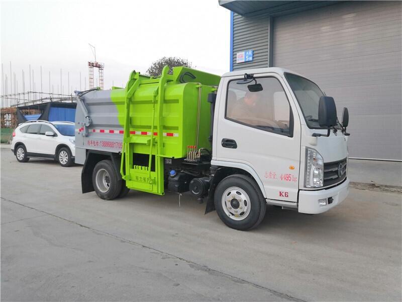 将桶装餐厨泔水垃圾经专用提升架缓缓上提,在车顶部倒入车厢内(车箱可分为箱体和罐体),被投放的垃圾经过强有力的推板挤压,在罐体内实现固液分离,被分离的液体进入罐体底部的污水箱,固体垃圾被压缩储存在罐体,体积变小,如此反复待装满后送至餐厨垃圾资源处理厂。