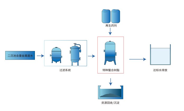 ? 传统沉淀法不能满足日益提高的 要求(如电镀表三镍含量要求0.1mg/l以下)。针对特定重金属离子的特点,利用螯合树脂的特种功能基团与重金属离子形成络合物的特性,实现重金属离子的回收利用及深度去除。