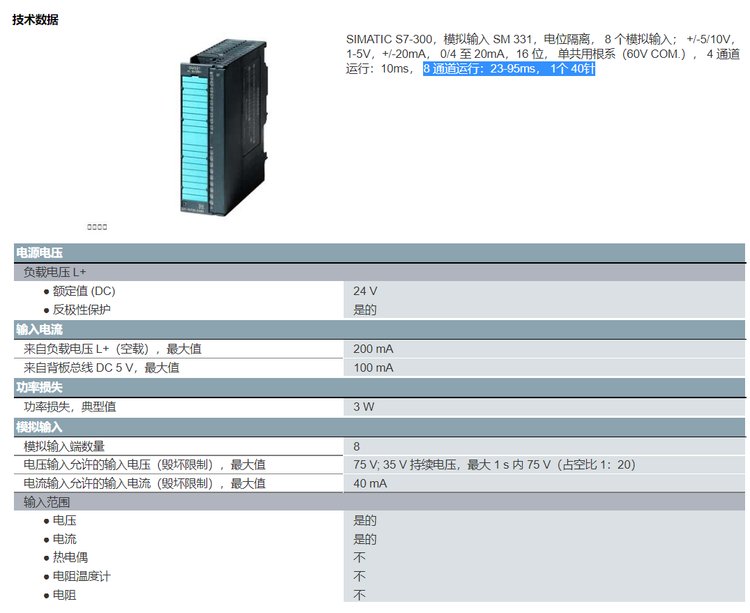 系统能力 | 模拟输入 SM 331,电位隔离, 8 个模拟输入 | ||