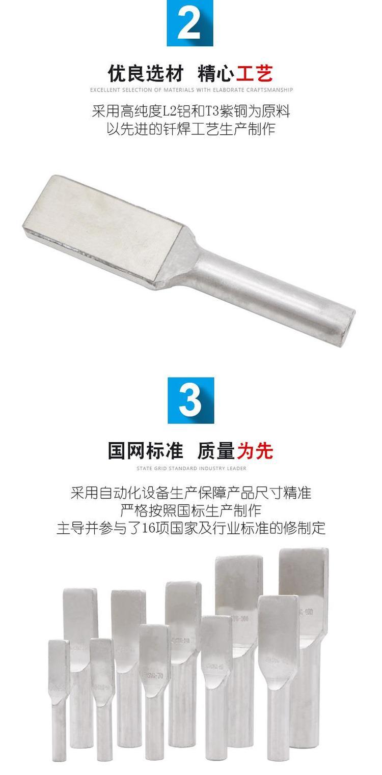 定型的铜铝过渡线夹采用闪光焊、摩擦焊和钎焊工艺方法制造。闪光焊工艺已纳入国家标准,摩擦焊早已广泛用于240mm2以下导线的接线端子制造。载流量1000A以下的设备线夹采用钎焊。载流量500A以下可以推广用覆铜铝板。这种材料可以节约大量铜材,铜材耗用量仅为闪光焊的1/5~1/8.