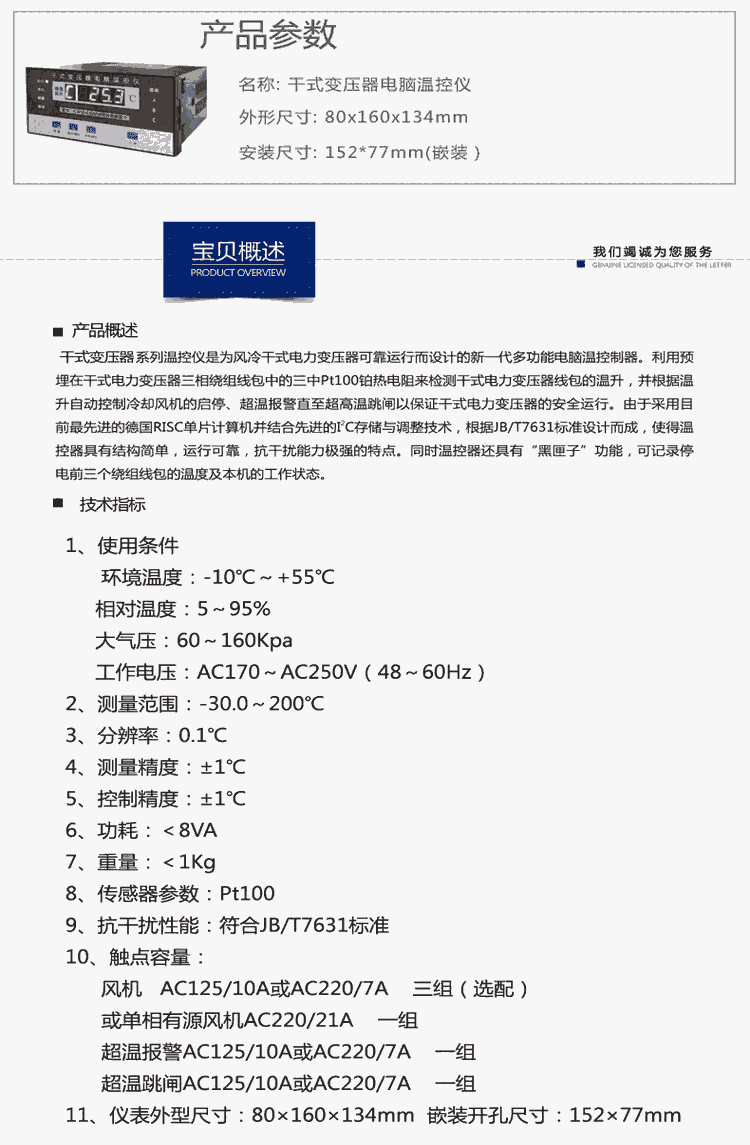BWD-3K130干式变压器温度控制器采用高性能PT100传感器,是保证干式变压器安全运行的控制装置。BWD-3K130该仪表设计新式,结构紧凑、牢固、显示醒目、直观,具有更加完善的系统保护、参数保存与输出指示等功能。其特有的温度超限报警,超温跳闸;负载断线报警输出,可以更好的保证无人值守供电系统安全、高效运行。本产品具有精度高、体积小、寿命长、安装方便,易使用等特点。