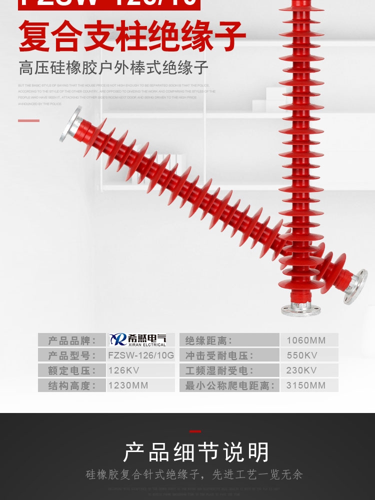 复合支柱绝缘子FZSW-220/10简介:复合绝缘子采用了特种钢材制造的金具,金具端头采用迷宫式设计原理,多层保护,密封性能好,解决了绝缘子最关键的问题----界面电气击穿。金具与芯棒的联接采用国际上最先进的电脑控制同轴恒压压接工艺,并配有全自动声发射探伤检测系统,保证了金具与芯棒的联接的可靠性与稳定性。芯棒采用ERC高温耐酸棒,芯棒与硅橡胶界面涂有特种偶联剂。伞套采用了高温高压下一次性整体成型工艺,配合电脑监控的二段硫化工艺,延长了产品的使用寿命。