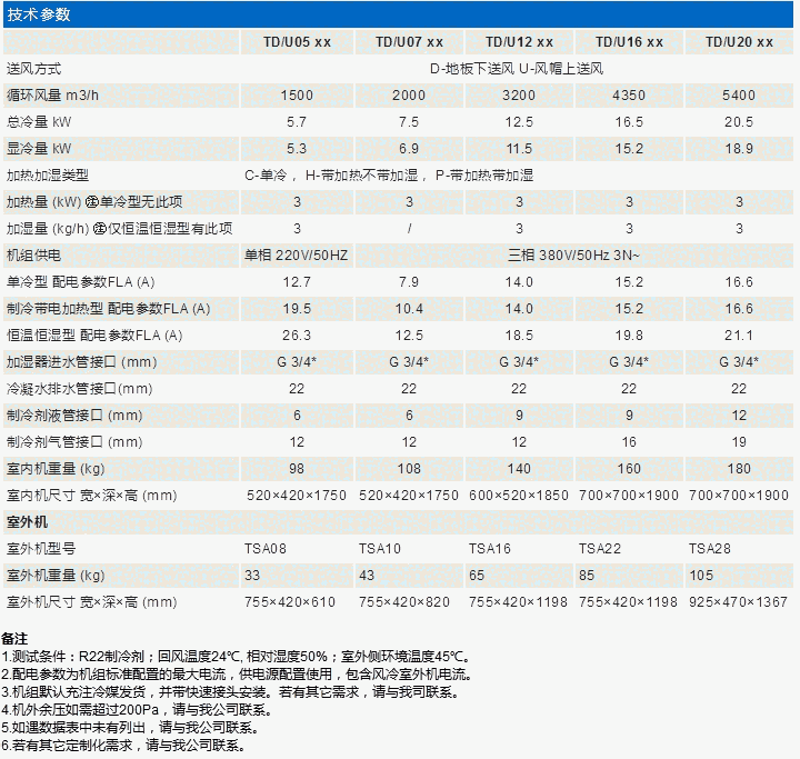 制冷范围涵盖5.5kW、7.5kW、12.5kW、16kW、20kW五个量段;高显热比,高能效运行;大面积蒸发器和冷凝器设计,制冷效率高。