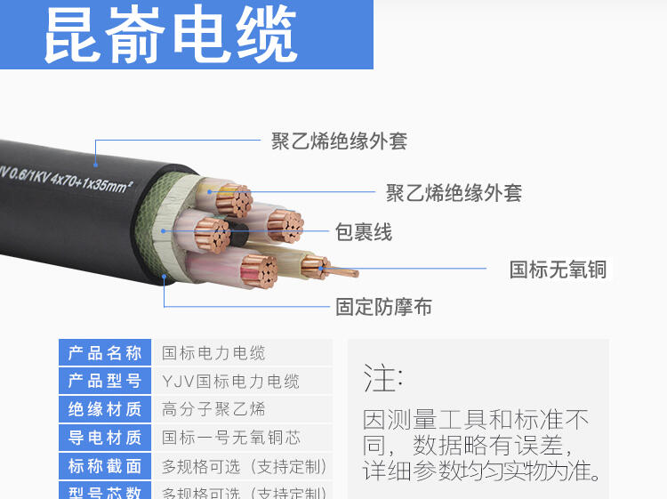 YJV电线电缆,即0.6/1kV交联聚乙烯绝缘聚氯乙烯护套电力电缆。本产品供额定电压为(U0/U)0.6/1kV电力线路输配电用,产品标准为GB12706长期允许工作温度为90℃,电缆安装时的环境温度不宜低于0℃。执行标准GB/T12706-2020