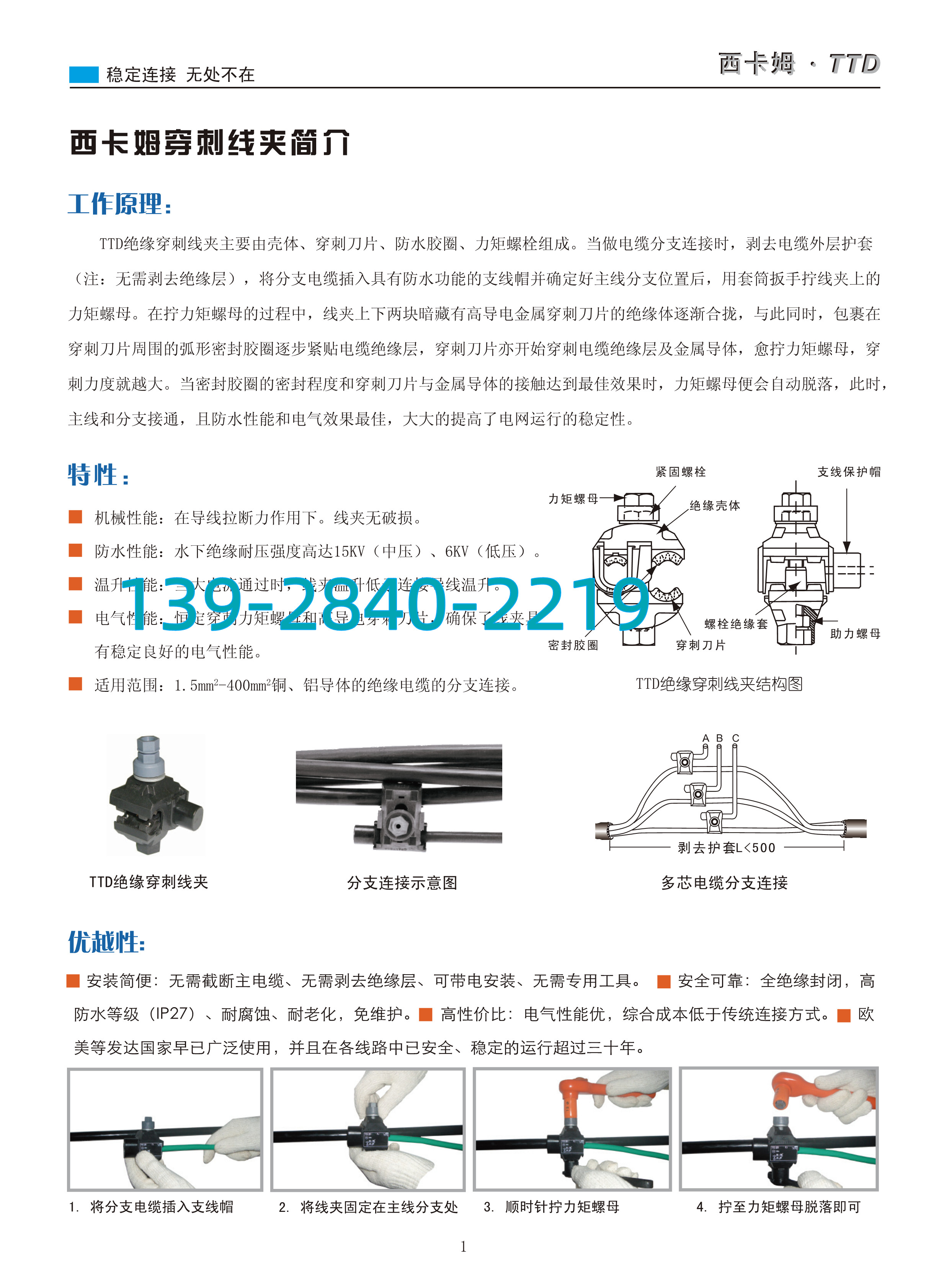 1KV电缆穿刺线夹 希卡姆电缆接线夹 电缆分支线夹安装: