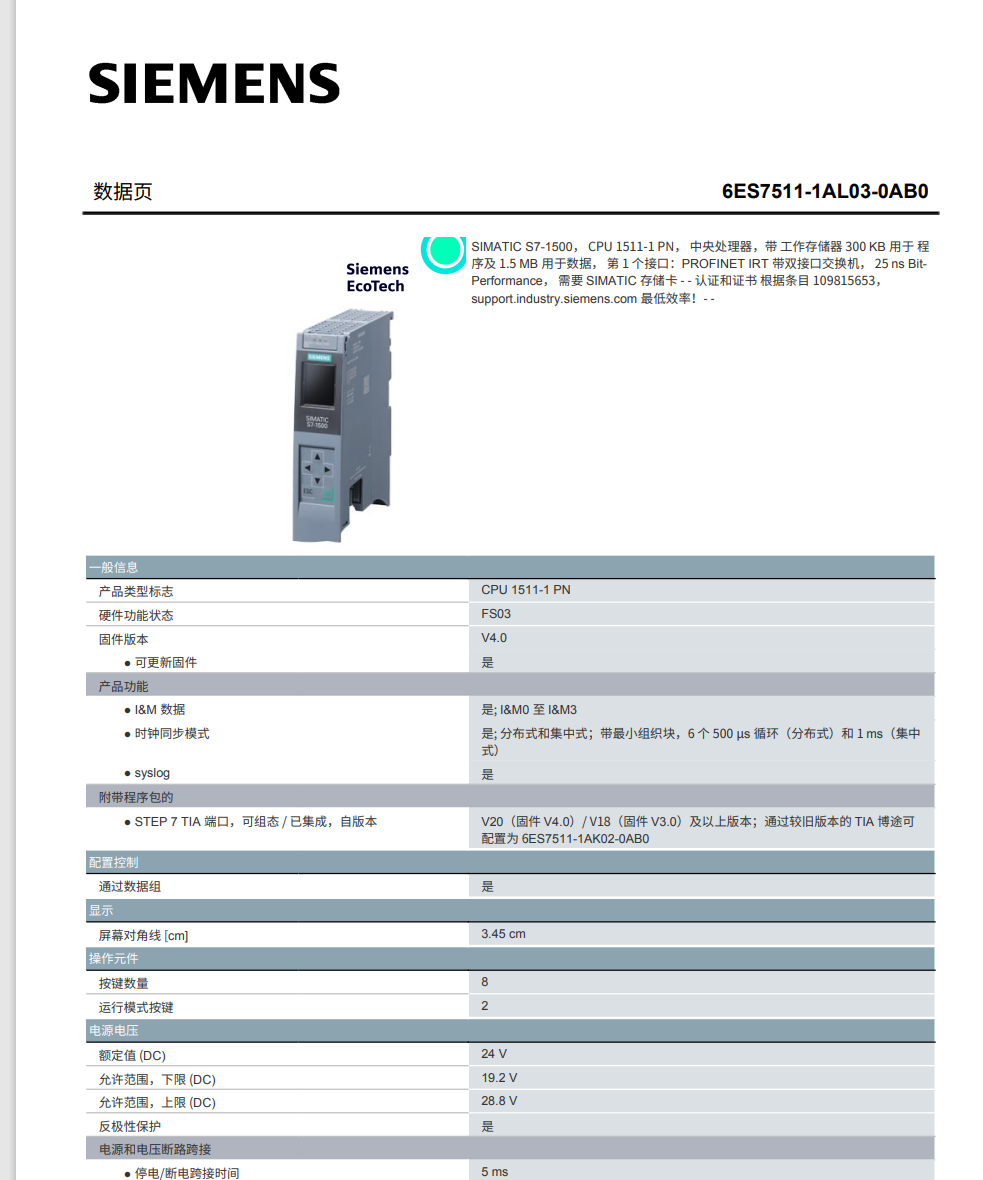 SIMATIC S7-1500, CPU 1511-1 PN, 中央处理器,带 工作存储器 300 KB 用于 程序及 1.5 MB 用于数据, 第 1 个接口:PROFINET IRT 带双接口交换机, 25 ns Bit-Performance,