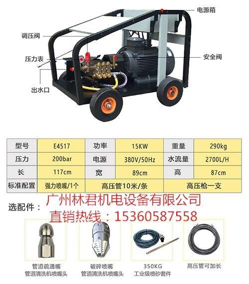 E4517管道清洗机专为管道清洗、疏通及各类高压清洗机作业设计,可以疏通直径:10-500毫米管道,清洗长度60米。适合小区、市政下水管道的清洗疏通及清除各种管道、列管堵塞物等作业。