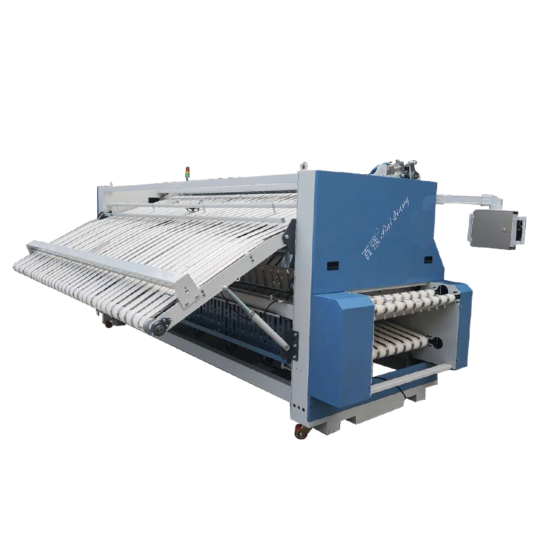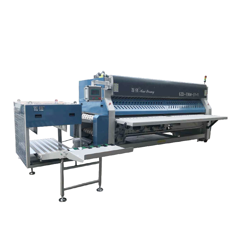 3.3米高速折叠机 酒店床单被套折叠设备 洗衣厂整理设备 百强高速折叠机1. 可以实现 2 横 +3 纵的折叠方式,2 横可以选择刀折或者气折,3 纵全部采用刀折;