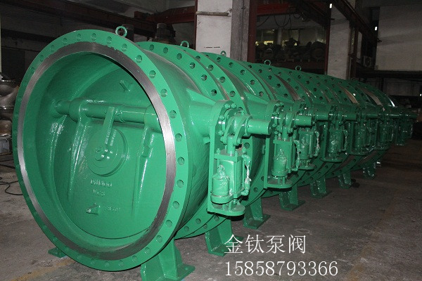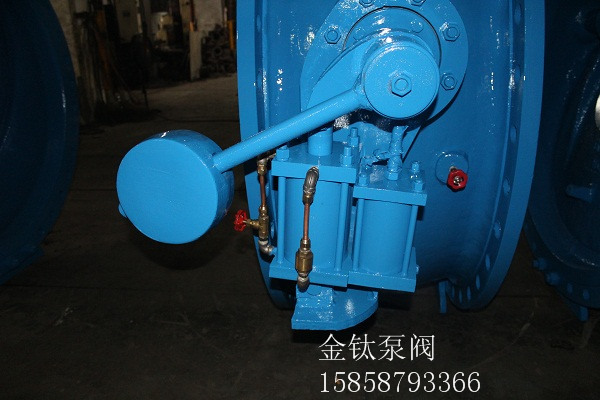 蝶式.缓闭止回阀主要由阀体、两块半圆阀瓣、回位弹簧、储油缸、缓闭小气缸、针型阀(微量调节阀)组成。靠进口介质的推力作用,将两块阀板平稳推开。在此同时,进口的压力介质周日入储油缸内活塞的下部,推动活塞,将活塞上部的油通过针型阀分别太入阀体两侧小油缸尾端,使小气缸内的活塞杆伸出,当进口介质压力下降自动关闭。但由于活塞杆处于伸出位置,顶住阀瓣不全部关闭,还剩有20%左右的面积使介质通过,从而起到了消除水锤的作用,阀瓣被活塞杆项住,活塞后腔的压力通过针型阀缓慢进入储油缸,阀瓣逐渐关闭。阀瓣分成先快速后缓慢两步关闭,达到了既防电机逆转又起到了消降水锤静音的作用。