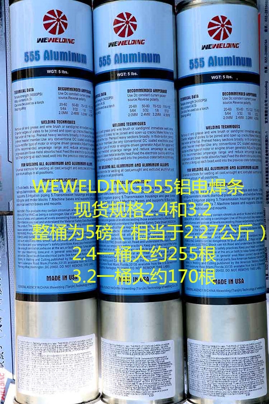WEWELDING555铝电焊条整包装是5磅/桶,相当于2.27公斤,国内现货规格有2.4*357mm,3.2*357mm,,请知晓!