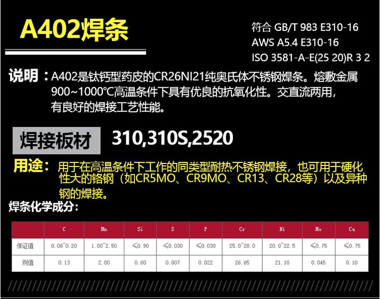 A022焊接尿素及合成纤维设备 A042不锈钢焊条钛钙型药皮的超低碳Cr23Ni13Mo2不锈钢焊条,可交直流两用。由于焊缝金属中加入适量的钼,故提高了焊缝金属的抗裂性及耐腐蚀性能。用于相同类型的超低碳不锈钢材料及异种钢焊接等。焊前焊条须经150℃左右烘焙,尽可能采用直流电源,以免焊条发红。 A062焊接合成纤维、石油化工设备用同类型的不锈钢结构、复合钢和异种钢结构 A082用于 00Cr17Ni15Si4Nb 、 00Cr14Ni17Si4 等耐浓硝酸腐蚀钢的焊接和补焊 A802焊接硫酸浓度 50% 和一定工作温度及大气压力的制造合成橡胶的管道,以及 Cr18Ni18Mo2Cu2Ti 等钢种 A102 钛钙型 交直流金属化学成份(%)C≤0.08,Cr18.0~21.0Ni9.0~11.0 用于焊接工作温度低于300℃的耐腐蚀的OCrl9Ni9、OCrl9Ni11Ti的不锈铜结构。 A107 低氢钠型 直流金属化学成份(%)C≤0.08,Cr18.0~21.0Ni9.0~11.0 用于焊接工作温度低于300℃的耐腐蚀的0Cr19Ni9型不锈钢结构,也可焊接一些可焊性较差的钢材(如高铬钢等)以及堆焊不锈铜表面层。A132 钛钙型 交直流金属化学成份(%)C≤0.08,Cr18.0~21.0Ni9.0~11.0Nb8×C~1.00 用于焊接重要的耐腐蚀,含铌稳定的0Cr19Ni11Ti型不锈钢。 E9015-B3上海电力R407耐热钢焊条公司是一家专业从事焊接材料研发生产销售厂家。公司规模强大、技术先进、设备齐全。在同行业中位居前列,可为客户提供焊接技术及焊接工艺的咨询与服务。产品:耐磨焊条、药芯焊丝、阀门焊条、不锈钢药芯焊丝、不锈钢焊条、不锈钢焊丝、铸铁焊条、碳钢焊条、碳钢焊丝、镍基焊条、镍基焊丝、钴基焊条、钴基焊丝、耐热钢焊条、耐热钢焊丝、铜焊条、铜焊丝、铝焊条、铝焊丝、银焊条、银焊丝、钛焊丝、模具焊条、模具焊丝、防水焊条、喷涂焊枪、金属粉末、砖机专用配件、碳化钨焊条、管状铸造碳化钨气焊条、埋弧焊丝、狼牙棒YD合金焊条等焊条焊丝以及各种特种焊接材料。