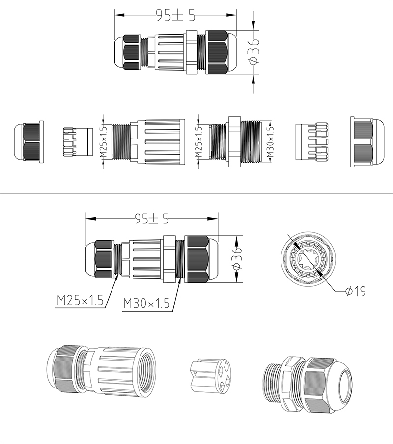 m25尼龙螺栓公母转换航空插头快速激光线对线功率直通防水连接器