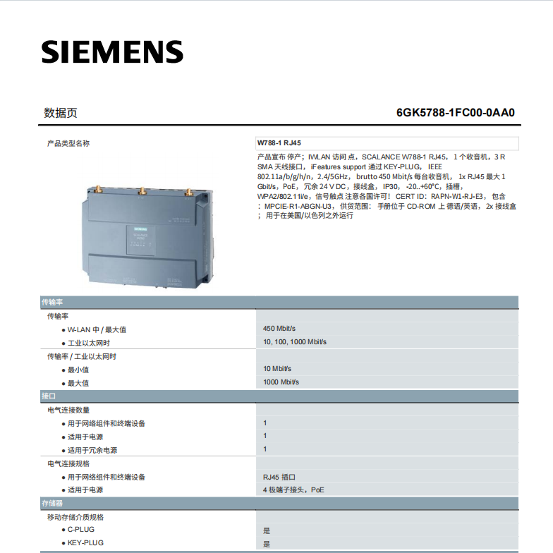 产品说明 | 1x 10/100/1000 Mbit/s M12 插口 | ||