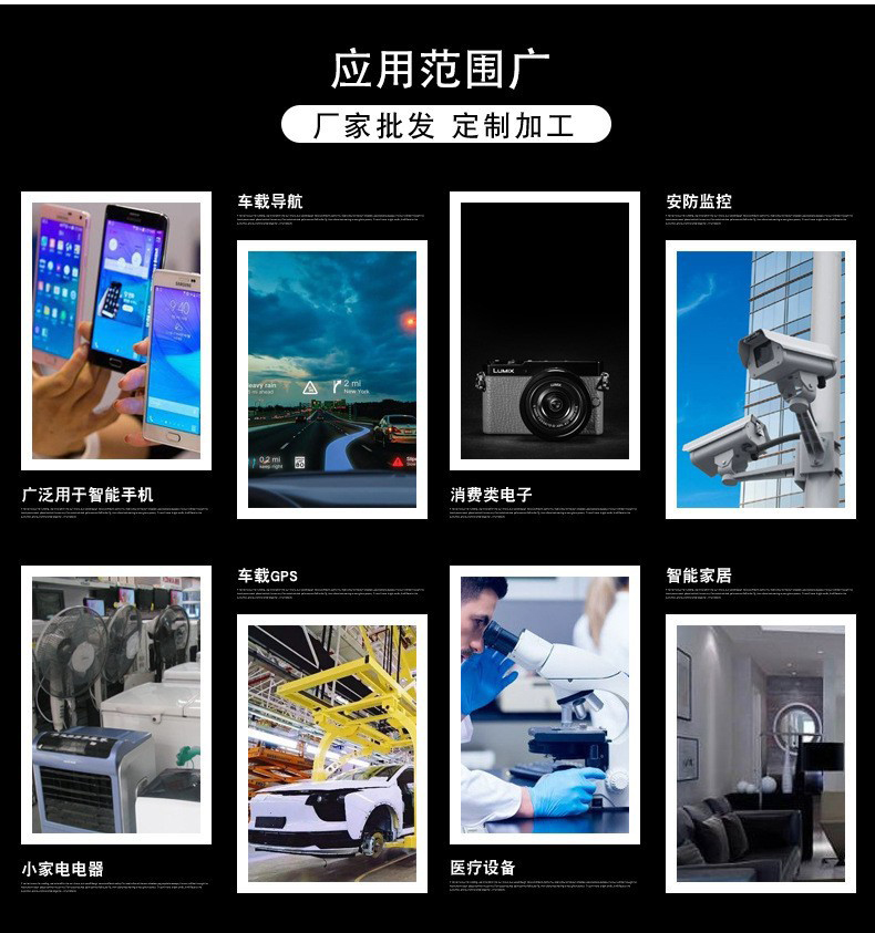 应用领域 | 泛用于智能手机 、小家电电器 、车载导航 、车载GPS 、消费类电子 、医疗设备、 安防监控 、智能家居、智能 | ||