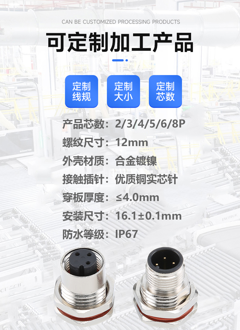m12金属螺纹3芯前锁公母插针头座光电线缆池盒逆变仪防水面板端子
