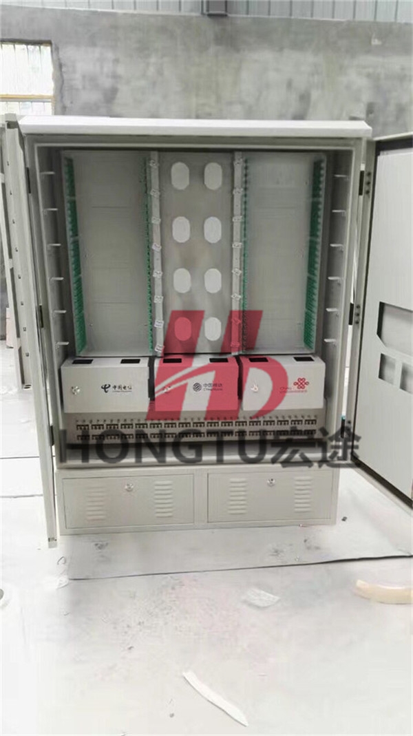 三网合一三网融合电信移动联通光缆交接箱,通常又称为街边柜,一般放置在主干光缆上,用于光缆分歧,它是一个无源设备,与原来的铜缆交接箱功能类似,只是将大对数的光缆,通过光缆交接箱后,分为不同方向的几个小对数光缆,当然,这个功能光缆接头盒也可以实现,但不同的是,光缆交接箱可以实现光缆的跳接,也可以用于测试和维护。一般,光缆交接箱是馈线光缆和配线光缆的划分点。